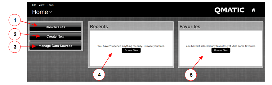 1. Browse Files – This button will open a File browser window, where you for example can find your saved reports, as well as the Canned Reports.