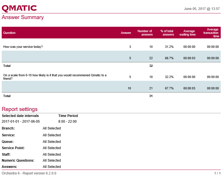 Answer | All the available answers defined by the parameter Answers. Note: Also, answers that were never provided should be included and have the number of answers = 0 and no info for waiting time or transaction time. |