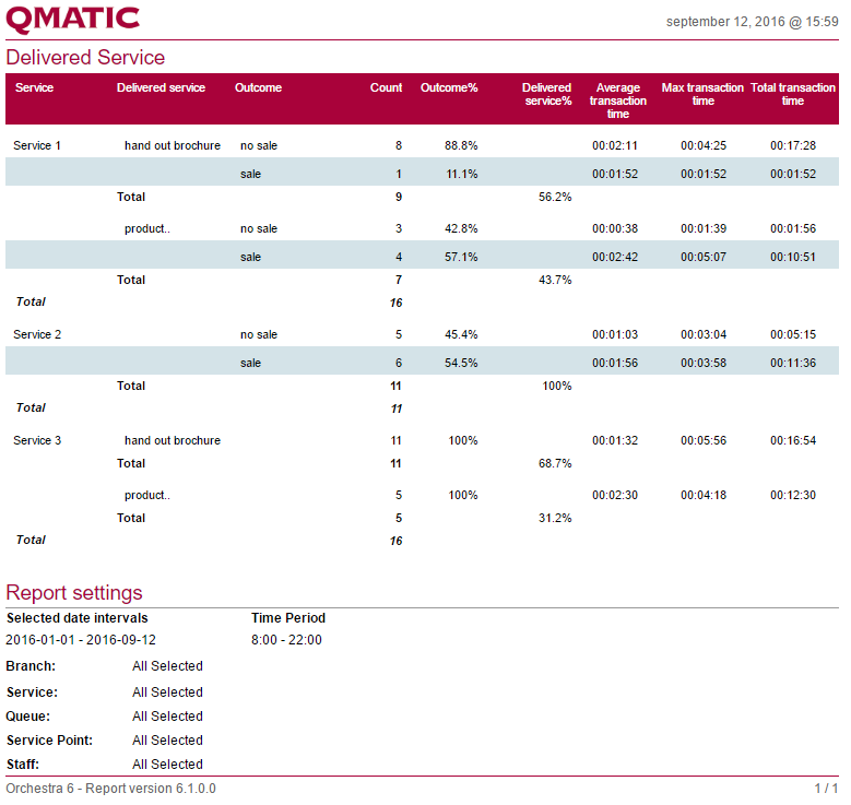 This report shows both the Delivered Services and the Outcomes per Service. For example, you can see the percentage of a Delivered Service that had a certain Outcome.