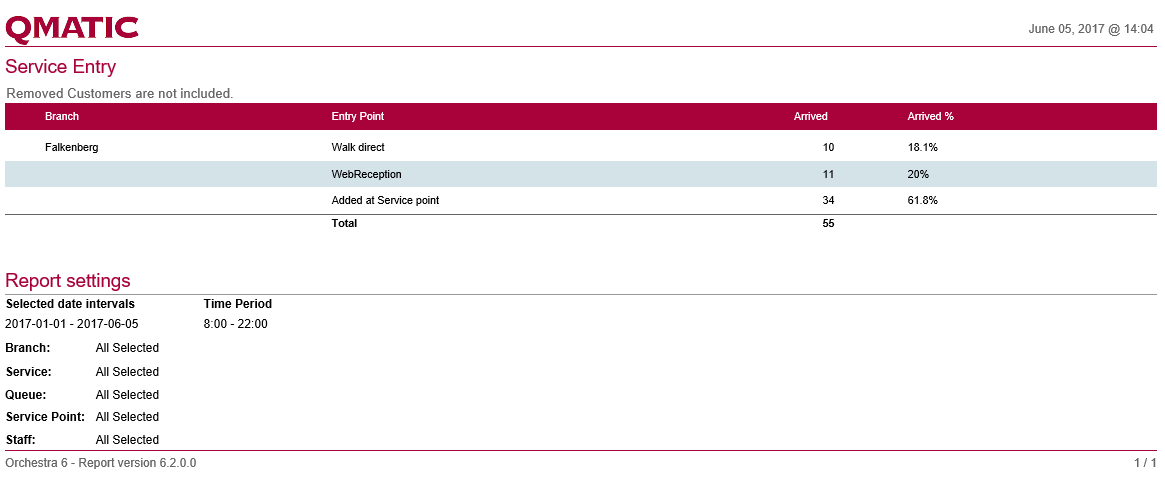 This report includes the entry points for Visits. This way, you can easily find out how the customers start their Visits, for example if they are using the Mobile Ticket, or if they were Walk direct Visits. Branches are presented separately.