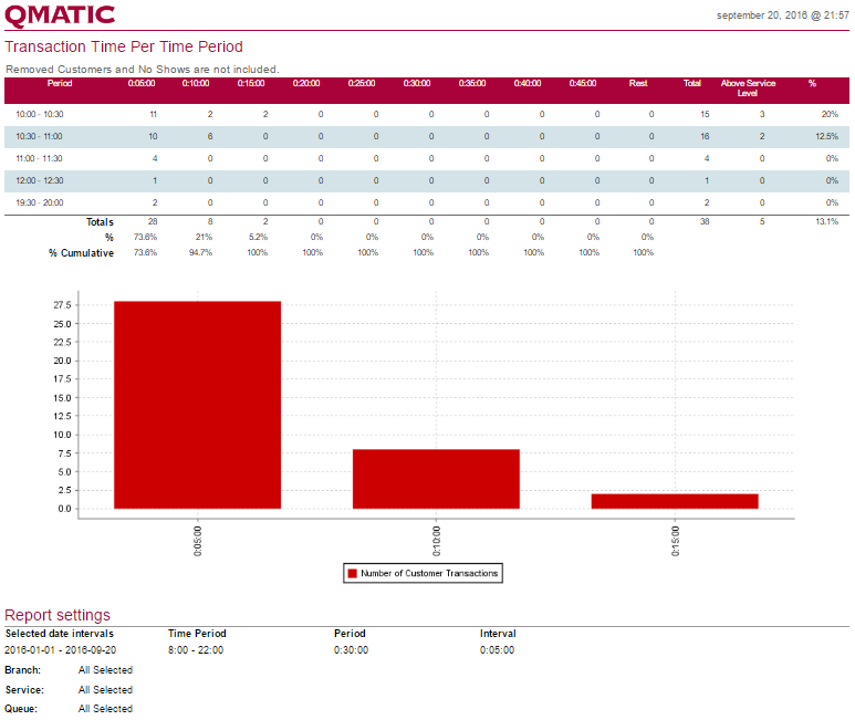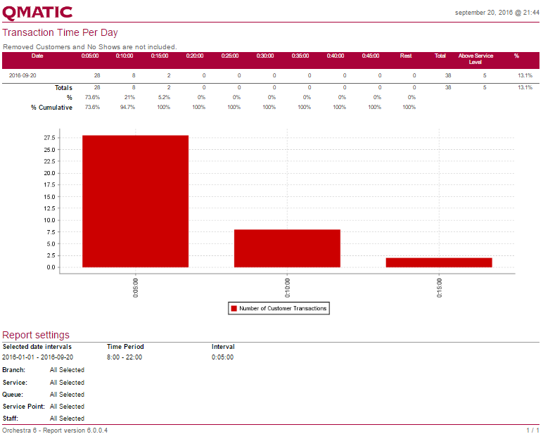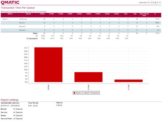 Intervals (00:05:00, 00:10:00, …) | The time intervals as defined by the Interval parameter. The report presents the number of transactions with a transaction time within the interval. The shown time is the end of the interval. |