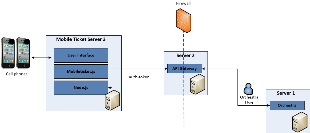 The picture below illustrates the architecture of the Mobile Ticket application, as well as how the different parts communicate with each other: