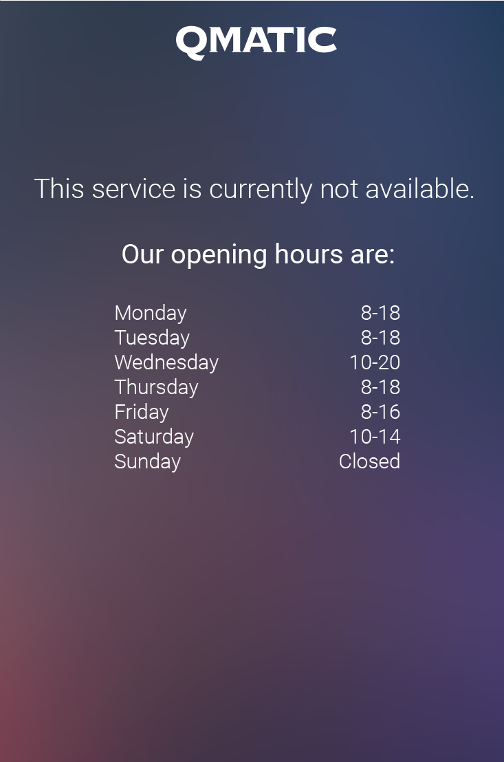 This functionality assumes that all branches as well as all devices used to access Mobile Ticket have the same time zone. If you need a more advanced opening hour functionality, please contact Professional Services.