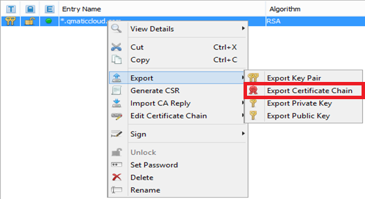 1. Open the keystore file in Keystore Explorer, right-click and select Export Certificate Chain, as in the example below: