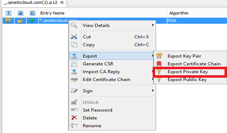1. Open the keystore file in Keystore Explorer, right-click and select Export Private Key, as in the example below:
