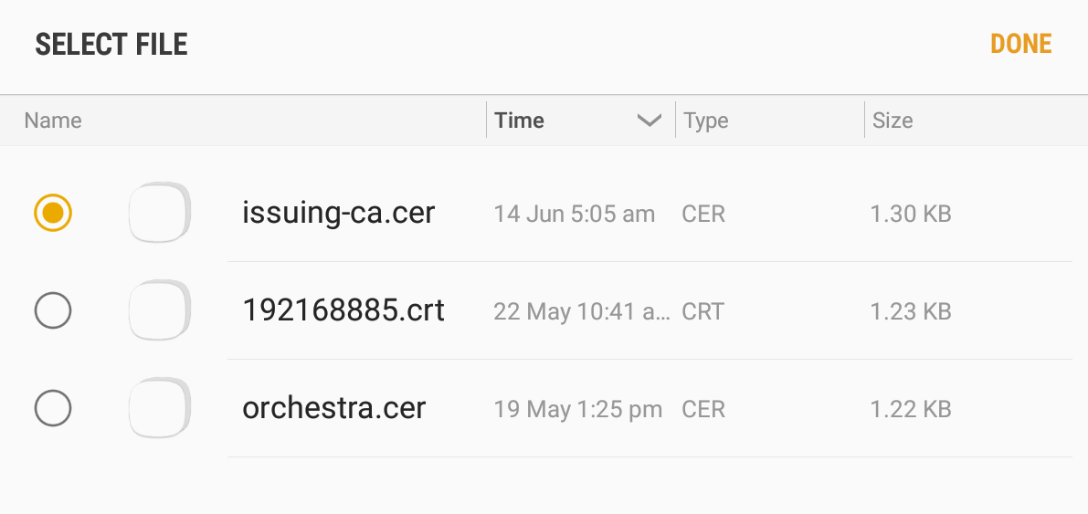 4. Select the wanted root certificate that you copied to the file system and click Done.