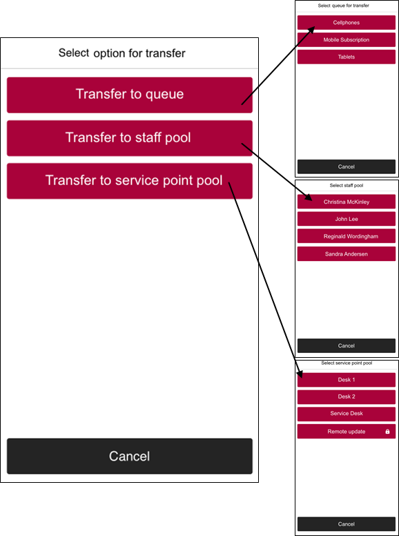 • If you want to transfer to a Queue, Staff Pool, or Service Point Pool.