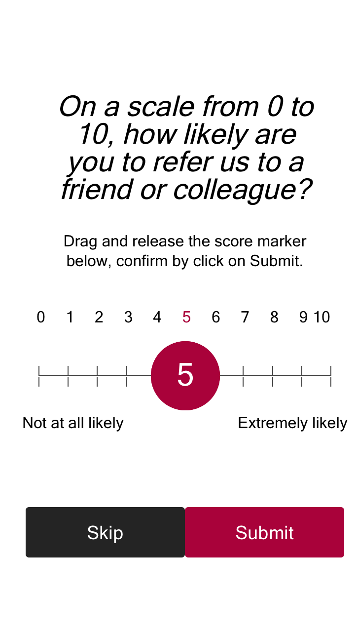 Here, the Customer can answer the question “On a scale from 0 to 10, how likely are you to refer us to a friend or colleague?”, by marking a number on the scale. When done, the Customer, or you, can click submit to enter the score. The Customer can also decide to click Skip, i.e not answer the question at all.